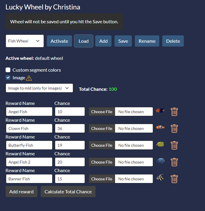 Use the Lucky Wheel Shuffle Wheel command to shuffle the rewards.